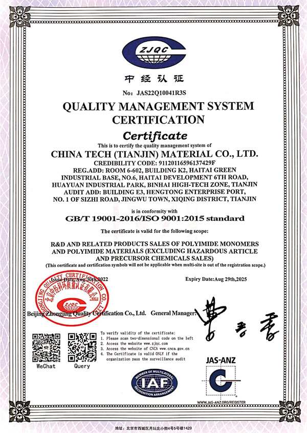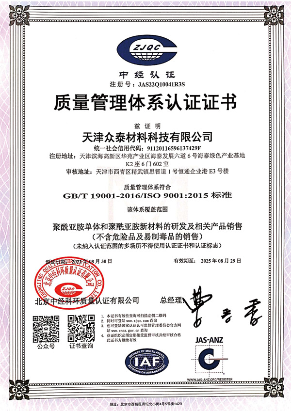 天津眾泰材料科技有限公司(以下簡(jiǎn)稱(chēng)“眾泰”),是一家“以先進(jìn)功能性聚酰亞胺單體研發(fā)生產(chǎn)為核心,致力于推動(dòng)全球聚酰亞胺材料產(chǎn)業(yè)發(fā)展”為使命的創(chuàng)新型高新技術(shù)企業(yè)。眾泰研制的聚酰亞胺單體目前已廣泛應(yīng)用于無(wú)色透明柔性聚酰亞胺薄膜、柔性顯示材料、5G新材料等諸多高科技領(lǐng)域產(chǎn)品的生產(chǎn)。